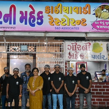 Girni Mehak Kathiywadi Restaurant, located in the heart of Navrangpura, Ahmedabad, brings you the authentic taste of traditional Kathiyawadi cuisine. We are known for our homely flavors, fresh ingredients, and warm hospitality. Enjoy our unlimited Kathiyawadi thali at just ₹130 per person, featuring popular dishes like vagharelo rotlo, dahi tikhari, dana muthiya, baingan bharta, sing bhujiya sabji, kaju lassan ki sabji, and more. Our restaurant offers a clean, comfortable ambiance, making it perfect for families and friends. Visit Girni Mehak Kathiywadi Restaurant to experience true Gujarati and Kathiyawadi food.